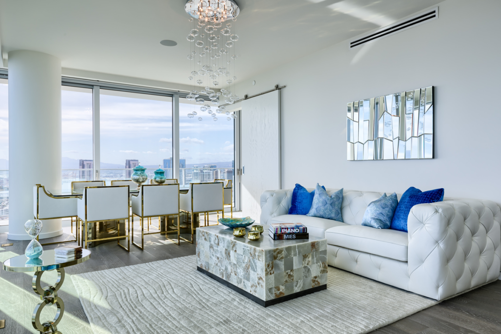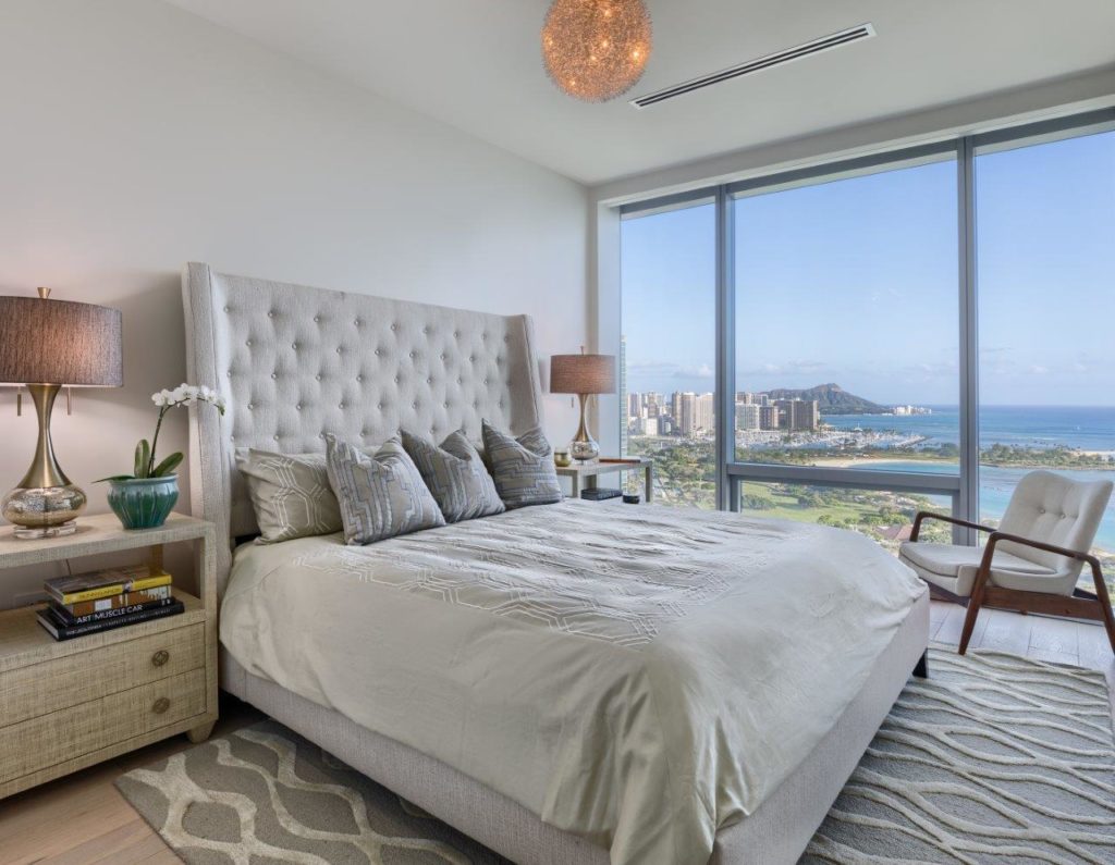 Leather on leather is the hot look on the runway this fall. While leather has always been a classic material for luxury interiors, we know if it’s trending onthe runway, it will be hitting Los Angeles interiors soon. The tufted white leather sofa and white leather dining set add comfort and style to this refined Waiea Tower condo.