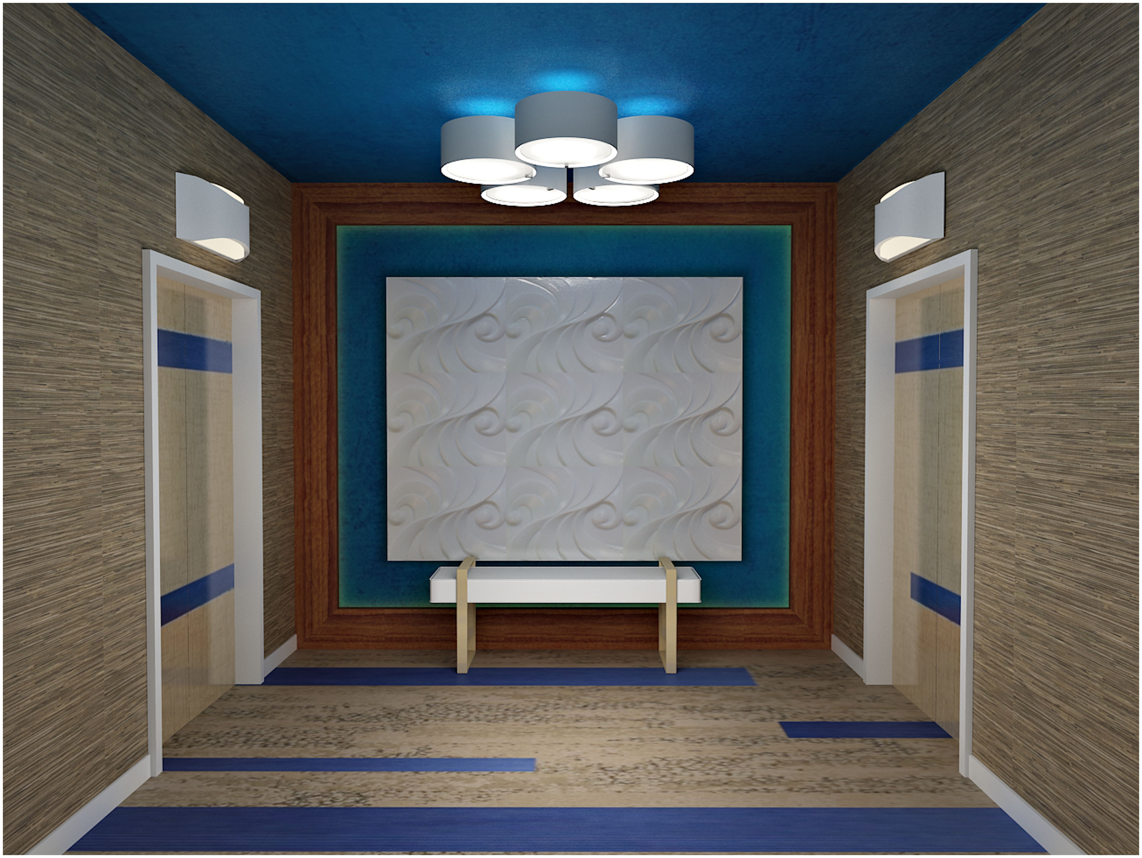 A boutique hotel in Hawaii, features an ocean theme to remind visitors of their splendid island setting. Hallways are done in natural tones with pops of bright blue and wave imagery to guide guests back to the ocean. Rooms are luxurious with plenty of texture and more neutral colors, making the large windows the focal point of the space.