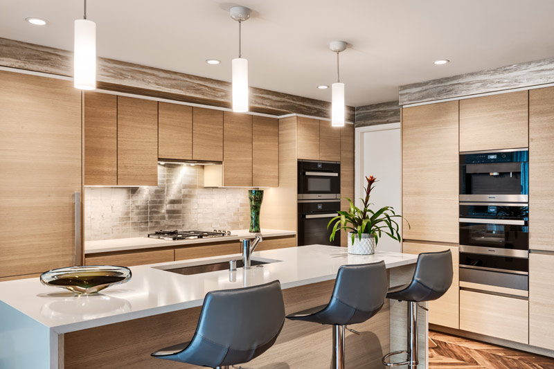 A minimalistic kitchen with a neutral color palette creates a calming space to prepare a meal. The dark green vase matches the emerald tones of the nearby plant and adds a pop of color to the room.  The wood cupboards and barn-board wallpaper create natural contrast against the metallic backsplash and white quartz countertops.
