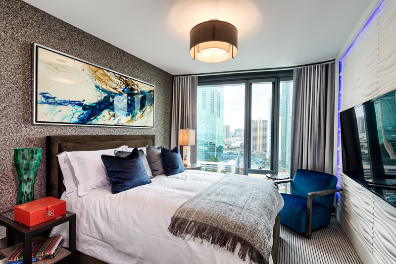 But it’s the bold statement walls that really elevate the look of this room. The rock wall at the head of the bed adds a rough, solid texture. While the 3D relief wall behind the TV provides contrast and a feeling of smooth, flowing movement.