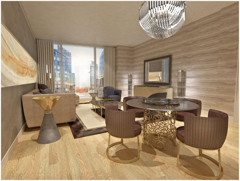 The clever use of reflective surfaces and vertical lines makes this Waterline Square living and dining area feel like it flows right out into the city. The neutral color palette and opulent finishes create a sophisticated yet soothing aesthetic that welcomes you home after a long day.