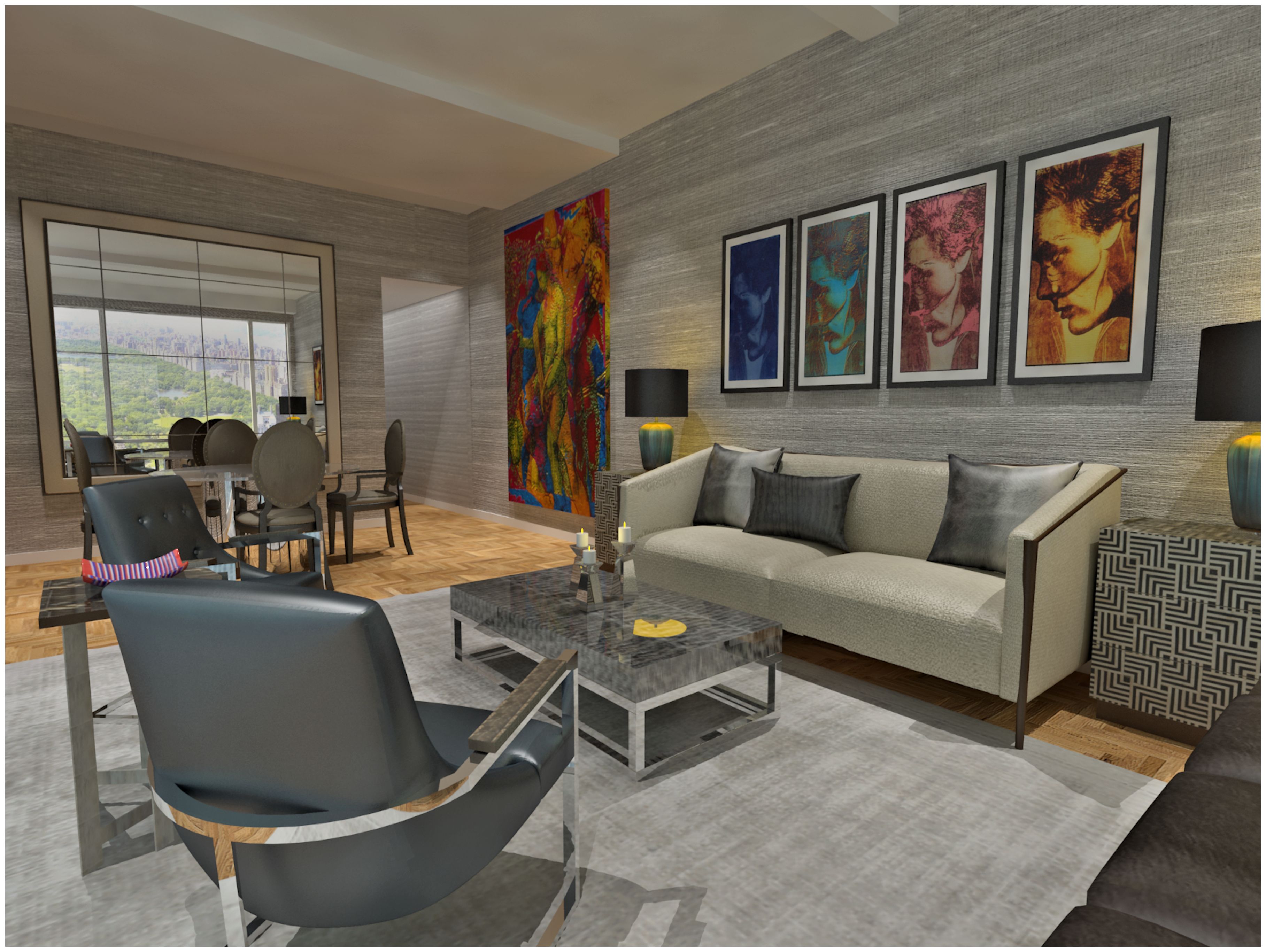 The large artwork in the dining room provides the inspiration for well-placed pops of color in the living room. The artwork over the couch continues the color from the large piece and draws the eye across the room to the impressive view of Central Park.