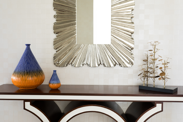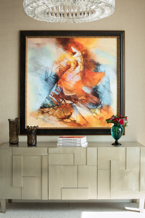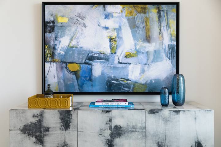 In addition to the yellow touches, other accent colors throughout the home are pulled from the artwork. Glass vases are an excellent way to incorporate color without adding a lot of visual weight. Area rugs in coordinating shades help tie each room together.